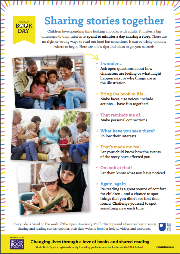 Share A Story Corner videos have familiar characters, easy to follow stories, and tips for reading together with your little ones. Look at the pictures together, guess what the characters are up to and ask your child what they think will happen next. You can find a range of video books here, and you can download the World Book Day sharing stories together poster here which contains some ideas for ways to explore stories.