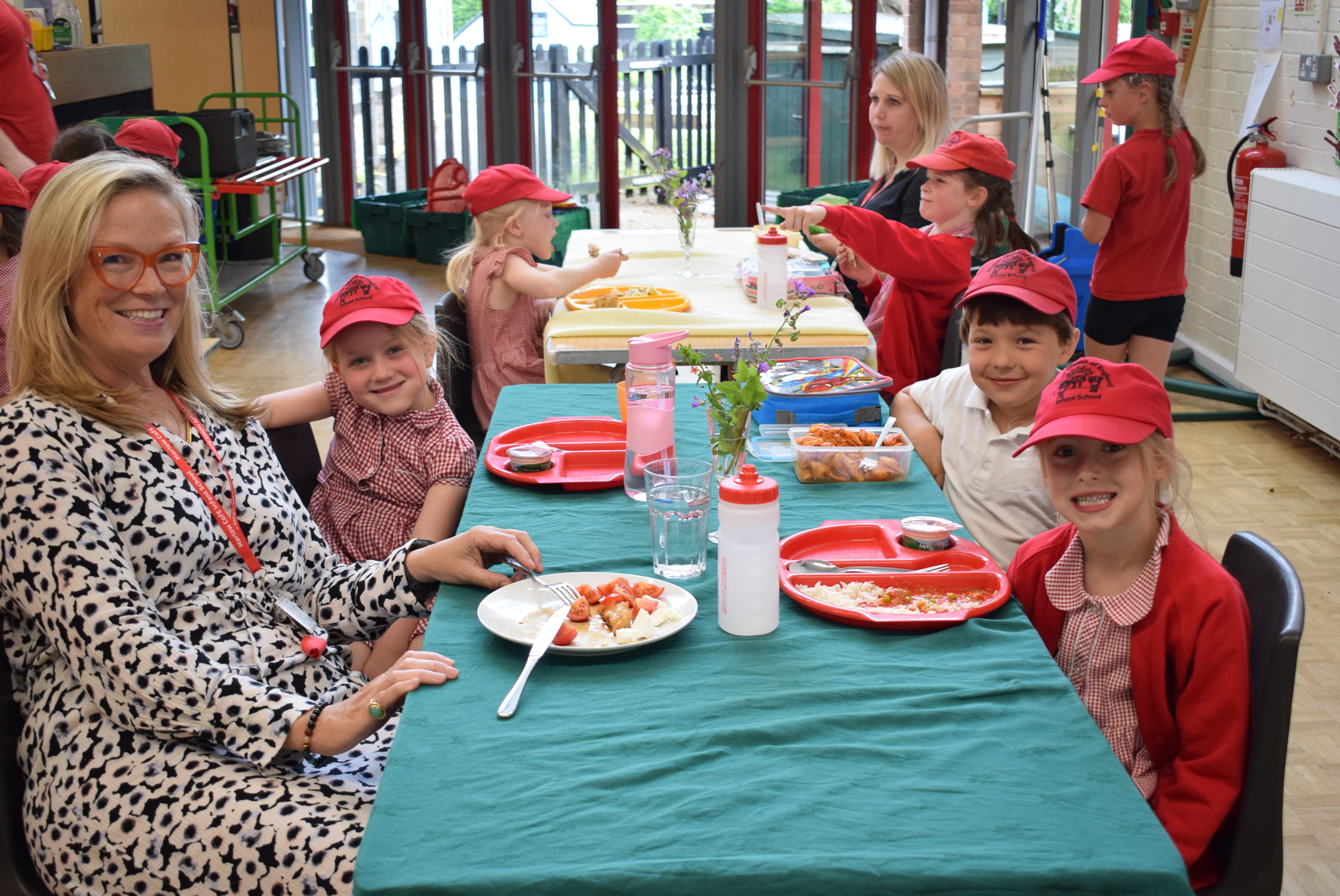 During lunchtime today, the two lucky Year 1 winners from the PFA Silent Auction were able to dine with Mrs Howarth and Mrs Browning. They invited 2 friends each, sat next to their teacher and chatted about lots of things. Mrs Howarth talked to Lottie and her friends about the summer holidays, weekend plans and rainbows, while Mrs Browning talked to Nico and his friends about football, summer holidays and what they would like to be when they grow up - they all said 'teacher'!