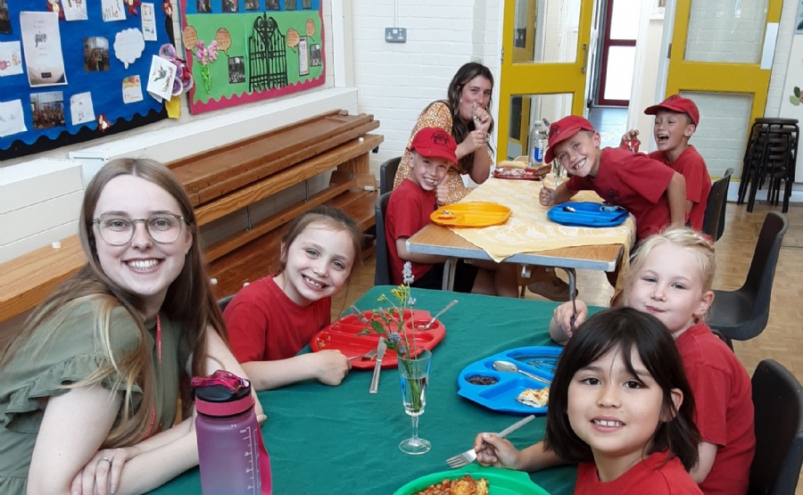 During lunchtime yesterday, the two lucky Year 2 winners from the PFA Silent Auction were able to dine with Mrs Mitchell and Miss Cubbage. They invited 2 friends each, sat with their teacher and chatted about lots of things. Mrs Mitchell talked to Esme and her friends about families, while Miss Cubbage talked to Joey and his friends about football and Galaxy World!