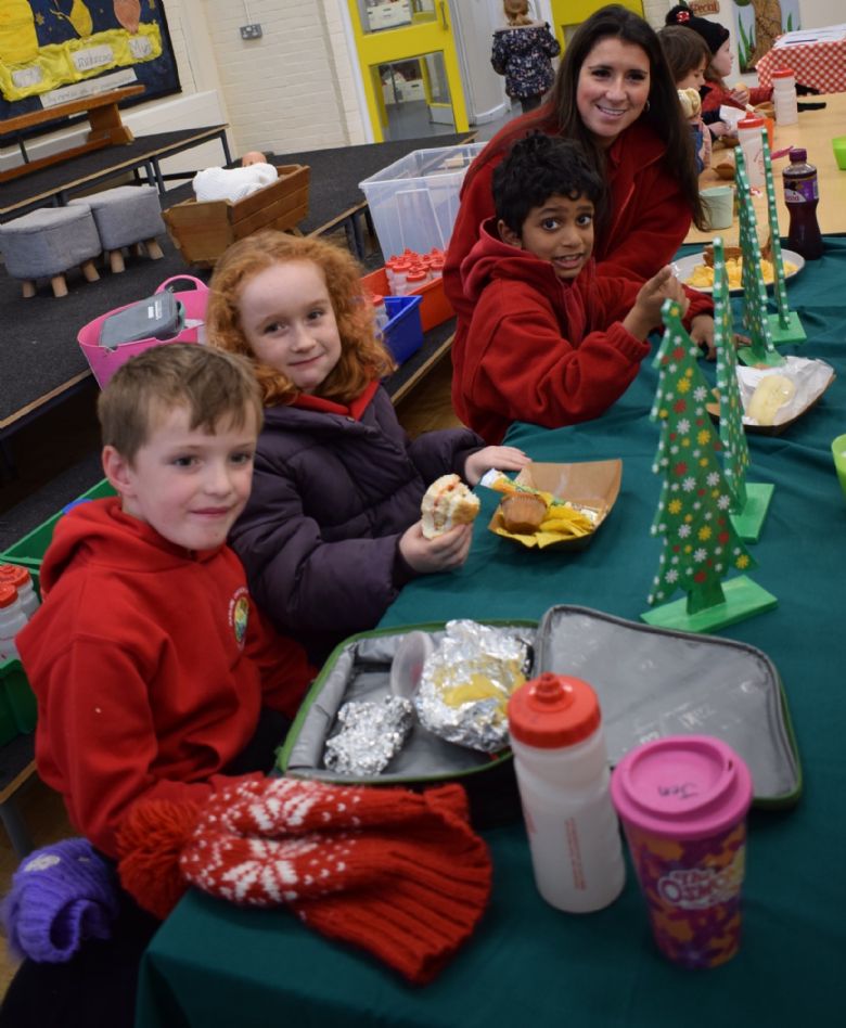 During lunchtime today, the two lucky Year 2 winners from the PFA Silent Auction were able to dine with Mrs Howarth and Miss Cubbage. They invited 2 friends each, sat with their teacher and chatted about lots of things. Mrs Howarth talked to Gabriel and his friends about what was on their Christmas lists, plans for Christmas. While Miss Cubbage talked to Arlo and his friends about siblings, Christmas food and presents!